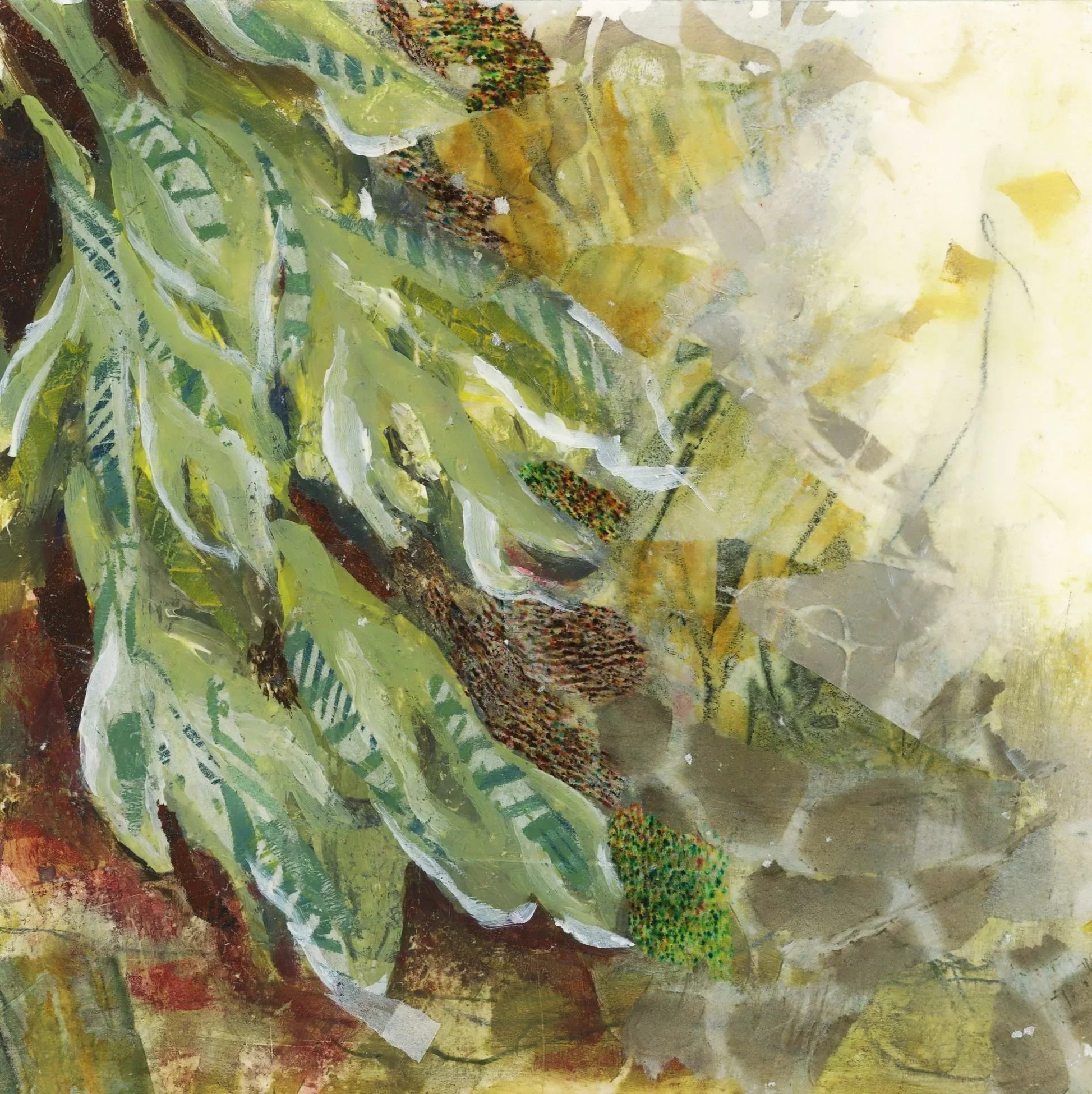 Each piece is created using a combination of acrylic paint and hand-painted collage papers. I build the surface through layering, adding texture and adjusting color so the forms feel dimensional and organic. This mixed media approach allows the fungi to emerge from the background much like they do in nature—gradually, with character and a sense of presence.