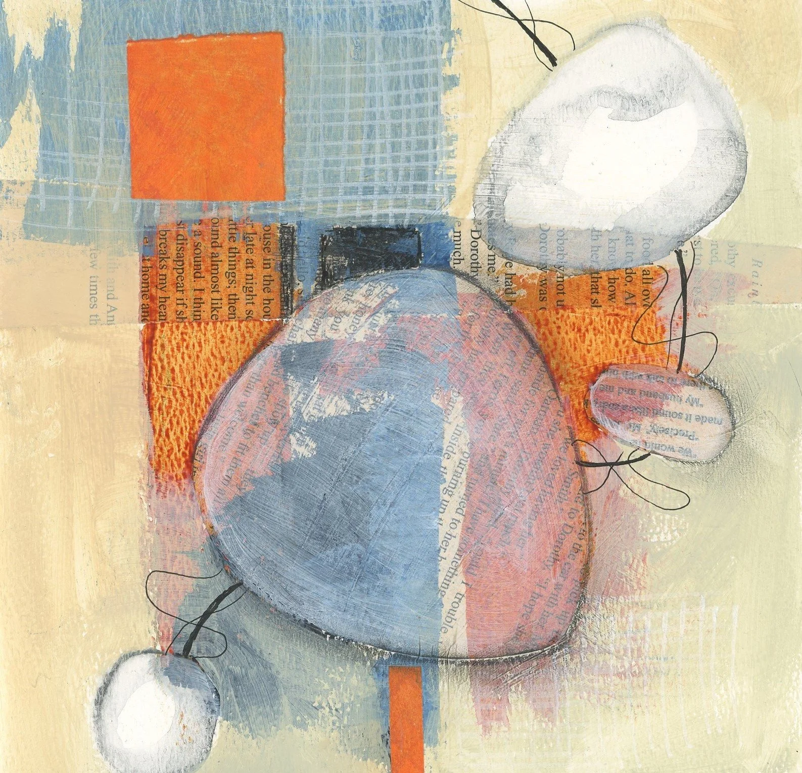 Each piece is created with acrylic paint and hand-painted collage papers, building a surface rich with texture, transparency, and pattern. I incorporate fragments of text, layered marks, and subtle shifts in color to give the work depth and structure. The combination of organic shapes and linear details creates a sense of rhythm and gentle imbalance—like something suspended, shifting, or held in place for just a moment.