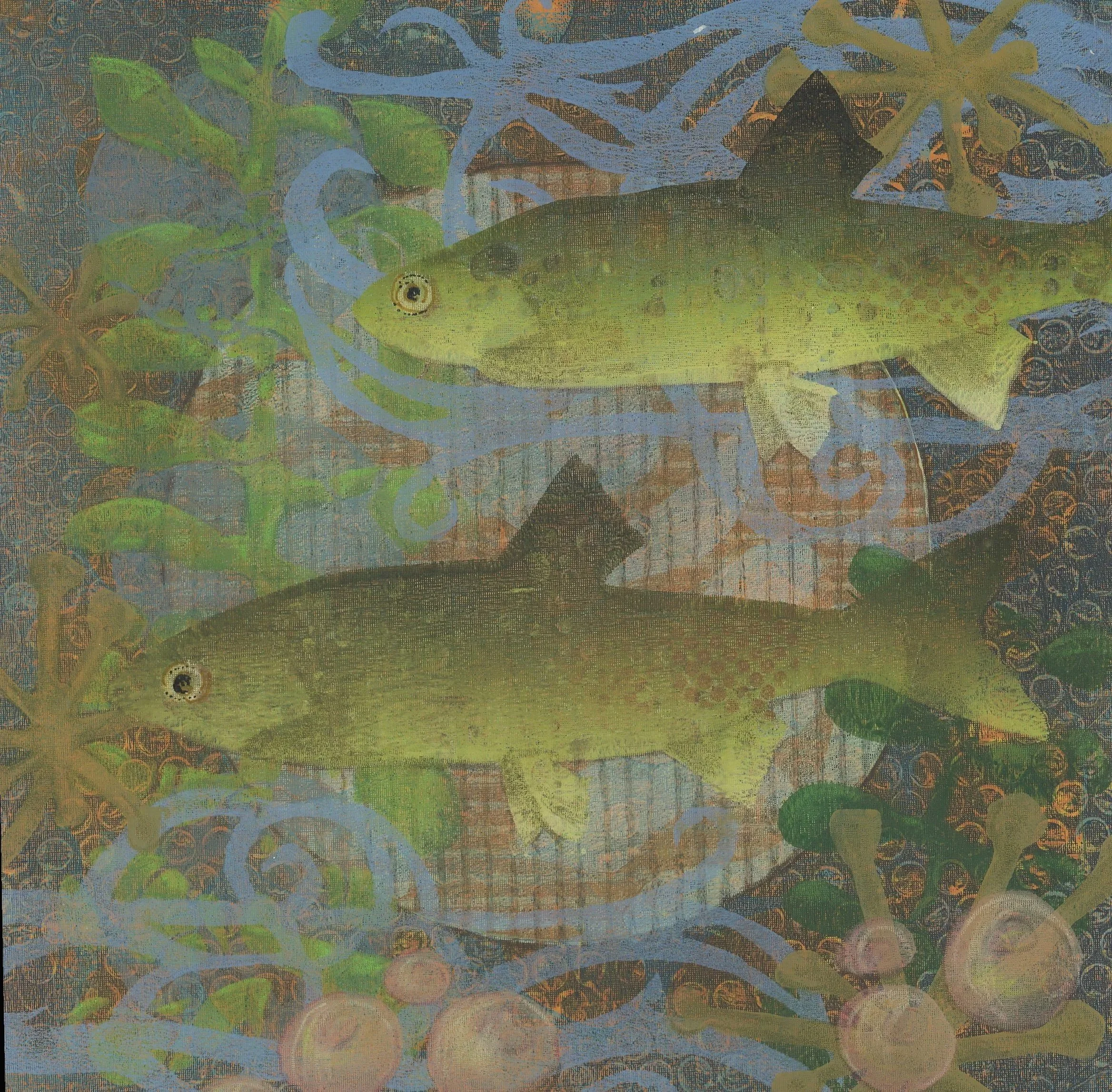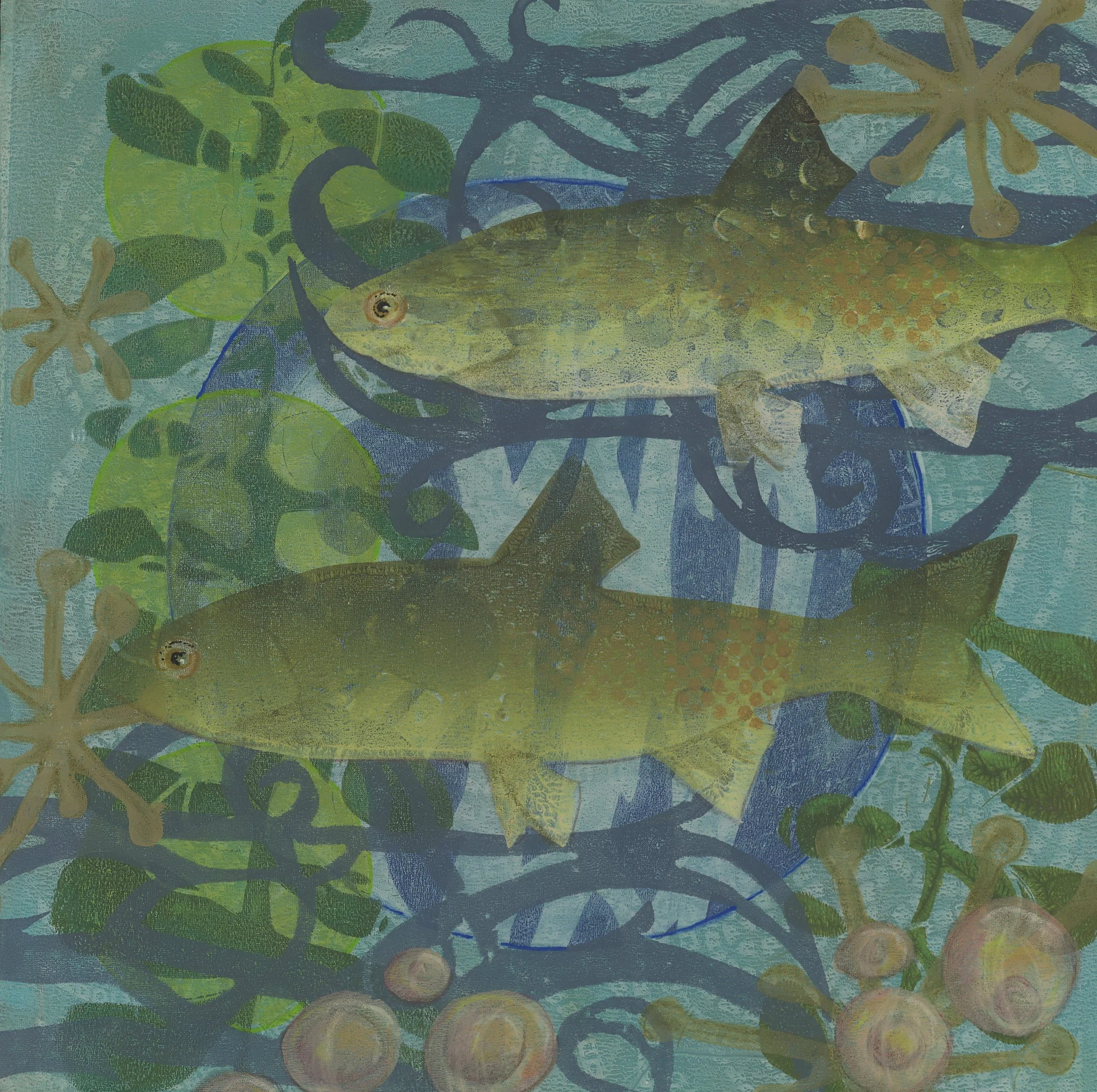 Every piece is created as a monotype, a single, hand-pulled print that exists only once. I build the imagery using layered color, texture, and pattern to capture the flow of water, the shimmer of scales, and the contrast between stillness and motion. The circles act as grounding elements within the composition, guiding the eye and echoing the repeating cycles found in nature.